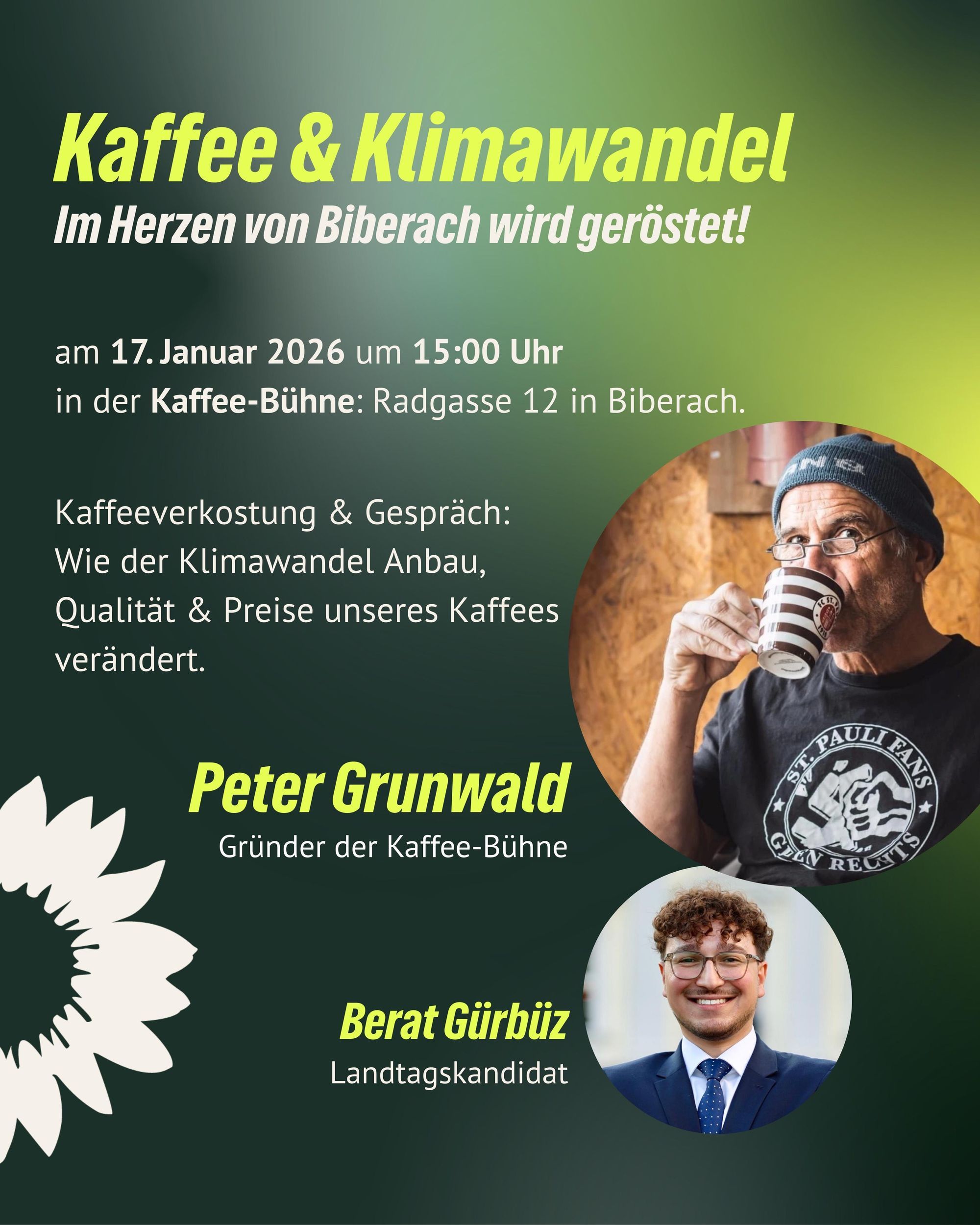 Komm gerne vorbei am 17. Januar 2026 zu unsere Veranstaltung um leckeren Kaffee ☕️ zu verköstigen und dich gemeinsam mehr über den Klimawandel und seine Effekte auf den Kaffeeanbau, die Preise und die Qualität zu erfahren. Mit dabei ist der Gründer der Kaffee-Bühne Biberach, Peter Grunwald und unsere Landtagskandidat Berat Gürbüz.